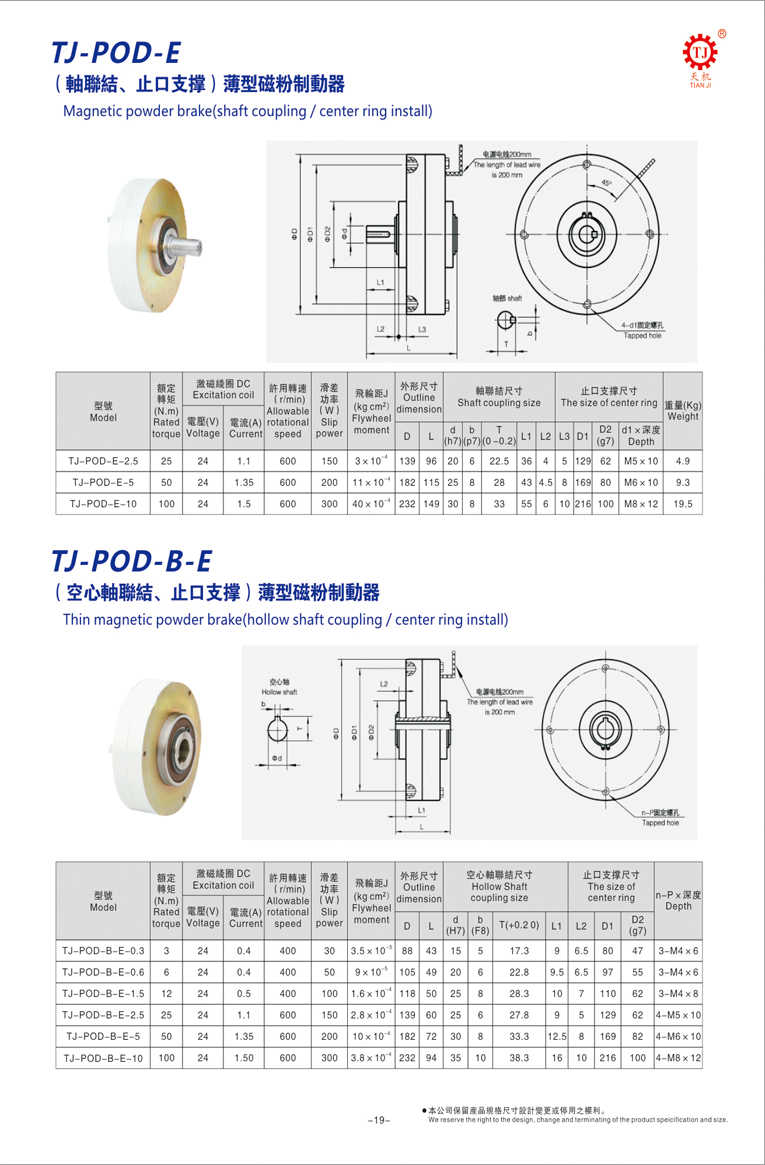 空心轴薄型磁粉刹车器相关参数:1、型号:TJ-POD-B-E;2、扭矩:3Nm~100Nm;3、许用转速:400-600r/min;4、滑差功率:30-300W;5、类型:薄型磁粉刹车器止口支撑。