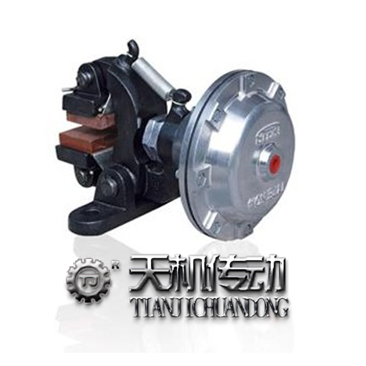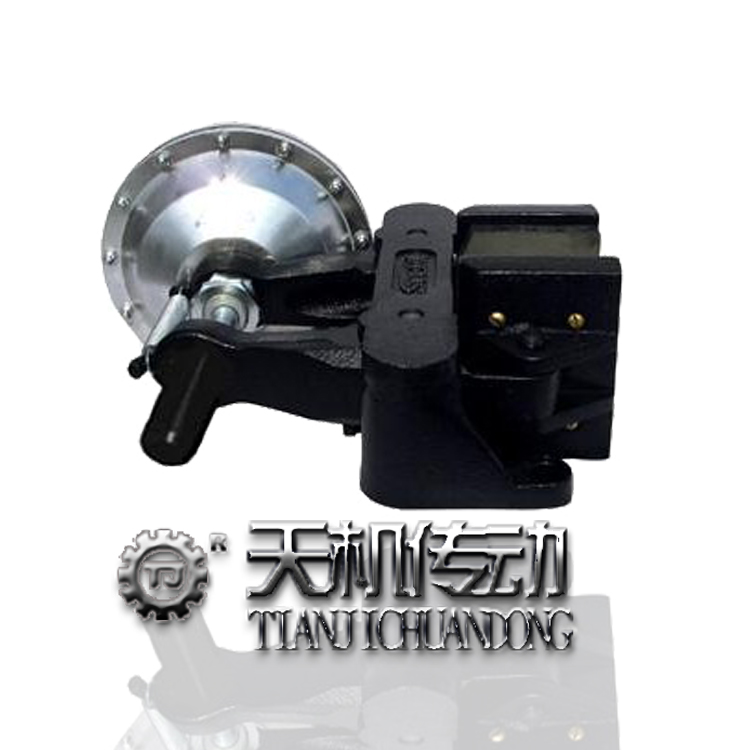 东莞天机传动生产销售的DBM-10油压碟式制动器,DBM-20油压碟式制动器统称油压碟式制动器,是装设于车辆刹车系统上,其包括有对应刹 车盘片的滑座、定位在车辆上的本体,该滑座则配合复位弹簧滑设在本体上。且本体配合滑座设有一控制阀组,该本体对应该控制阀组设有一个连接车辆油压系统的 油压槽,而油压槽则以迫掣组件迫掣刹车盘片;藉油压增压将本体的迫掣组件推动 刹车来令片夹掣刹车盘片进行刹车动作,藉刹车惯性作用力大于复位弹簧的弹力时 会让滑座在本体上位移,而滑座的位移量到达默认值(设计为惯性力较大值)时会运 用控制阀组关闭车辆油压系统的通路,再将油压槽油压释压,让刹车压力在瞬间降 低,并利用一复位弹簧的弹力再让滑座复位,藉此让滑座产生往复弧线运作,致使 本发明的碟式刹车器过度掣紧于该刹车盘片。