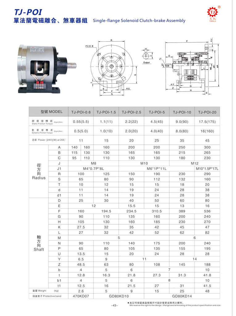 东莞天机传动(台湾天机牌)是生产单法兰电磁离合刹车器,法兰式电磁离合刹车器的厂家,全称为POI型单法兰电磁离合刹车器组合体,主要由一个TJ-A1型电磁离合器与一个TJ-B1型电磁制动器组合的集成组体。电磁离合刹车器应用广泛、结构简易、可高频运转、使用安全等。