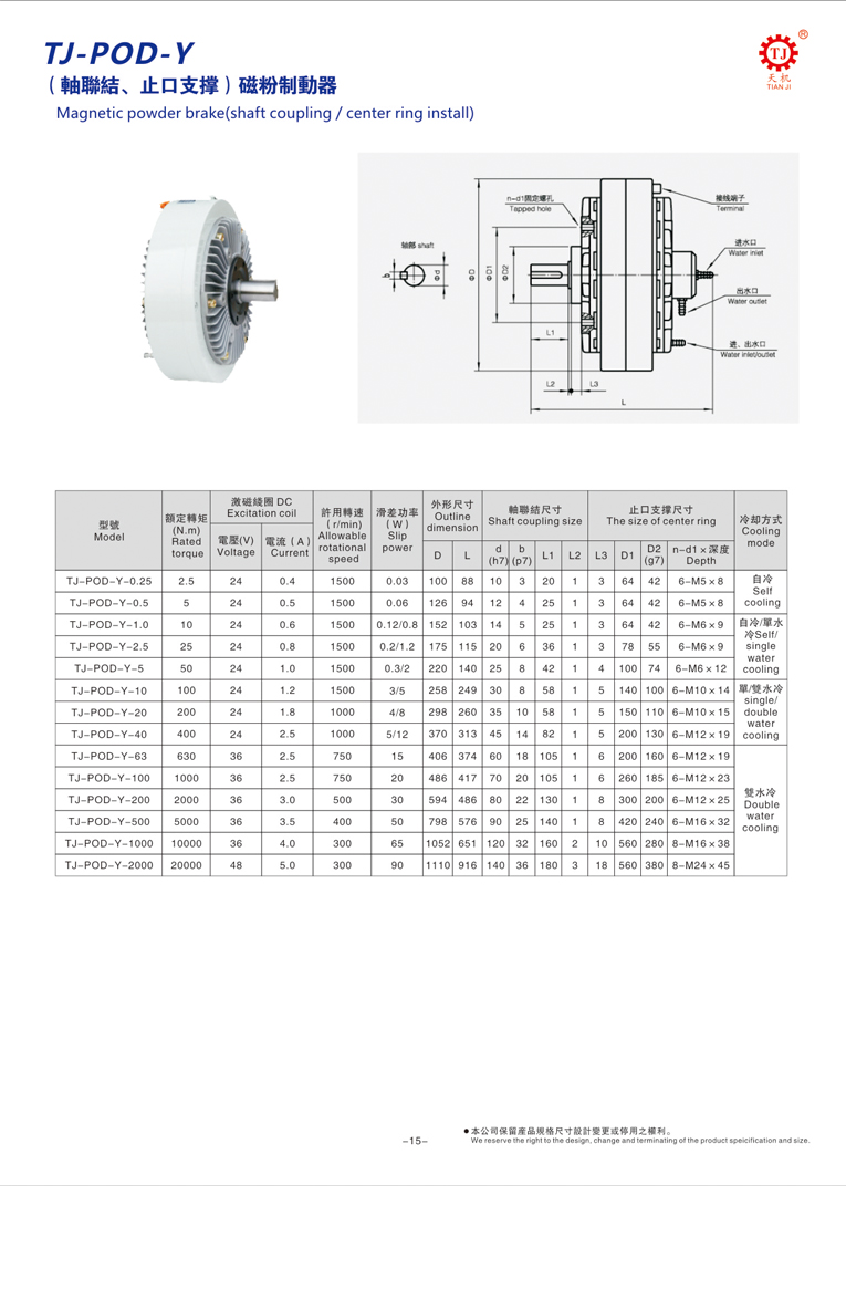 东莞天机传动(台湾天机牌)水冷磁粉刹车器和风冷磁粉制动器都是工业制动器中的一种,使用的DC24V直流电压,操作更加安全,使用简单,维护容易。